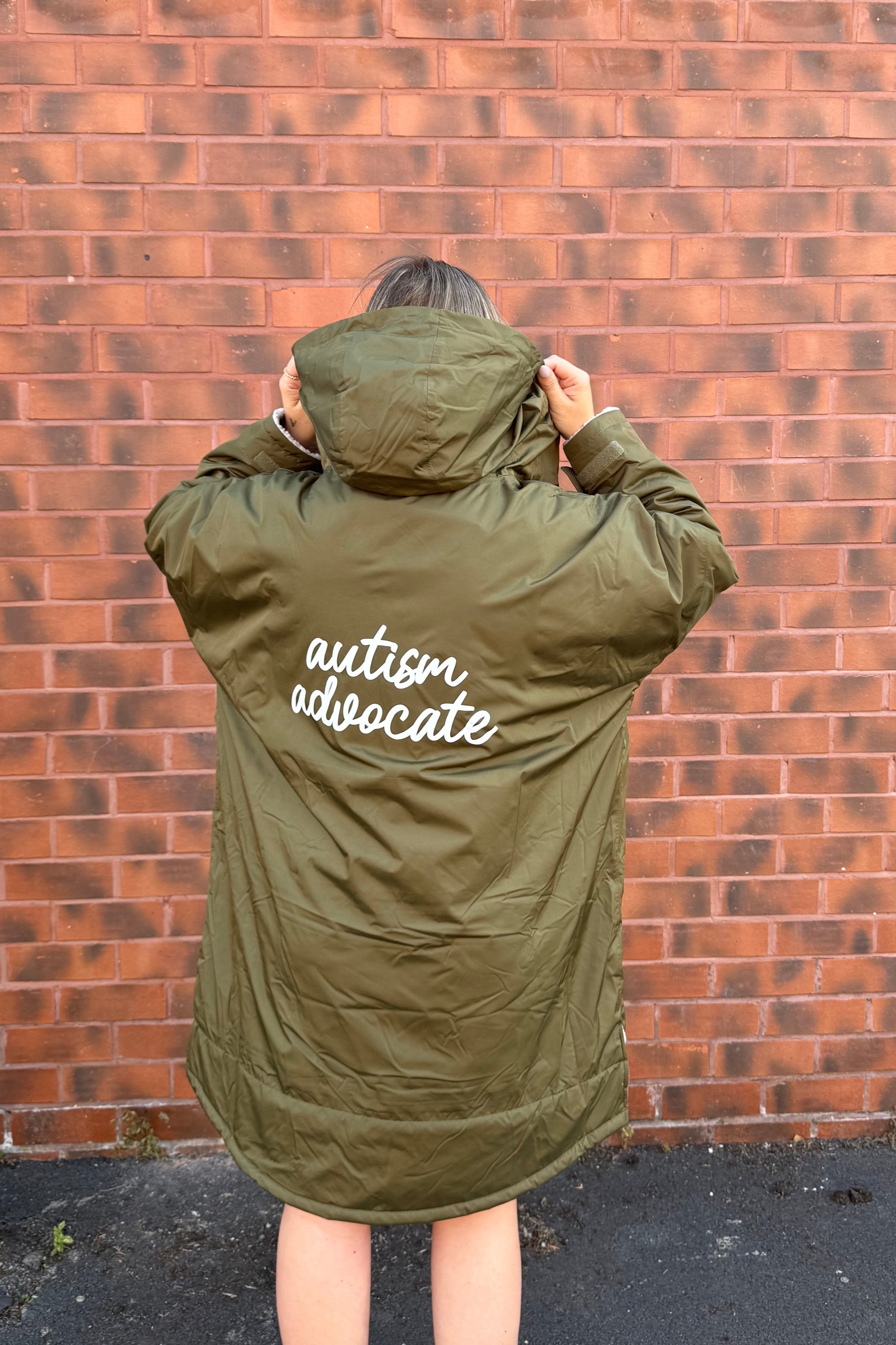 Unisex fit. Oversized. Full-length two-way plastic zip with easy pull toggles. Chin guard. Oversized fit. Side vents. Adjustable cuffs with hook and loop fastening. Side zip pockets. Inside pocket with zip on the left side. Inside patch pocket on the right side. 3-panelled hood. Loop on the centre back of the jacket for hanging the robe. Dropped back hemline. (5000/5000 waterproof and windproof). Waterproof taped seamed outer layer. Sherpa fleece interior. Each robe comes with carry bag with double drawstring straps.